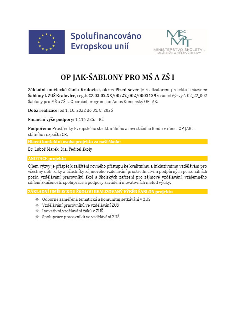 ZUŠ Kralovice je zapojena do projektu „Podpora uměleckého vzdělávání mladých talentů“, který pořádá Plzeňský Kraj.